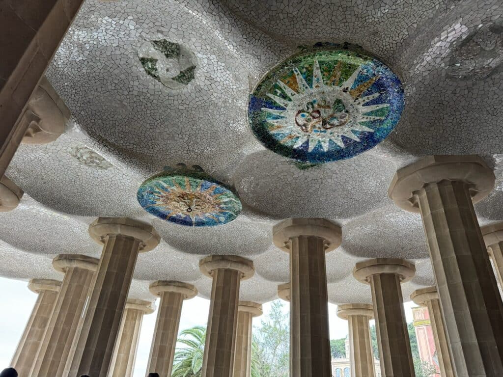 Look up to admire the circular mosaic medallions on the ceiling—each one uniquely crafted from broken ceramic pieces. The columns resemble tree trunks, reinforcing Gaudí’s vision of creating structures that feel organic and alive. Light filters through the space in shifting patterns, making it a dream for photography.