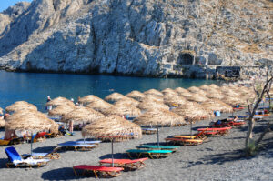 The coastline of Santorini is rugged and striking, with hidden coves, red‑ and black‑sand beaches, and steep cliffs shaped by centuries of volcanic activity. Being out on the water lets you see these formations up close while enjoying a calm, breezy escape from the crowds on shore. It’s one of the easiest excursions for cruise travelers because once you’re on board, everything is handled for you — the route, the timing, the food, and the swim stops. All you have to do is relax and enjoy the views.