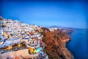Oia is Santorini’s most famous village, known for its blue-domed churches and stunning sunsets.
